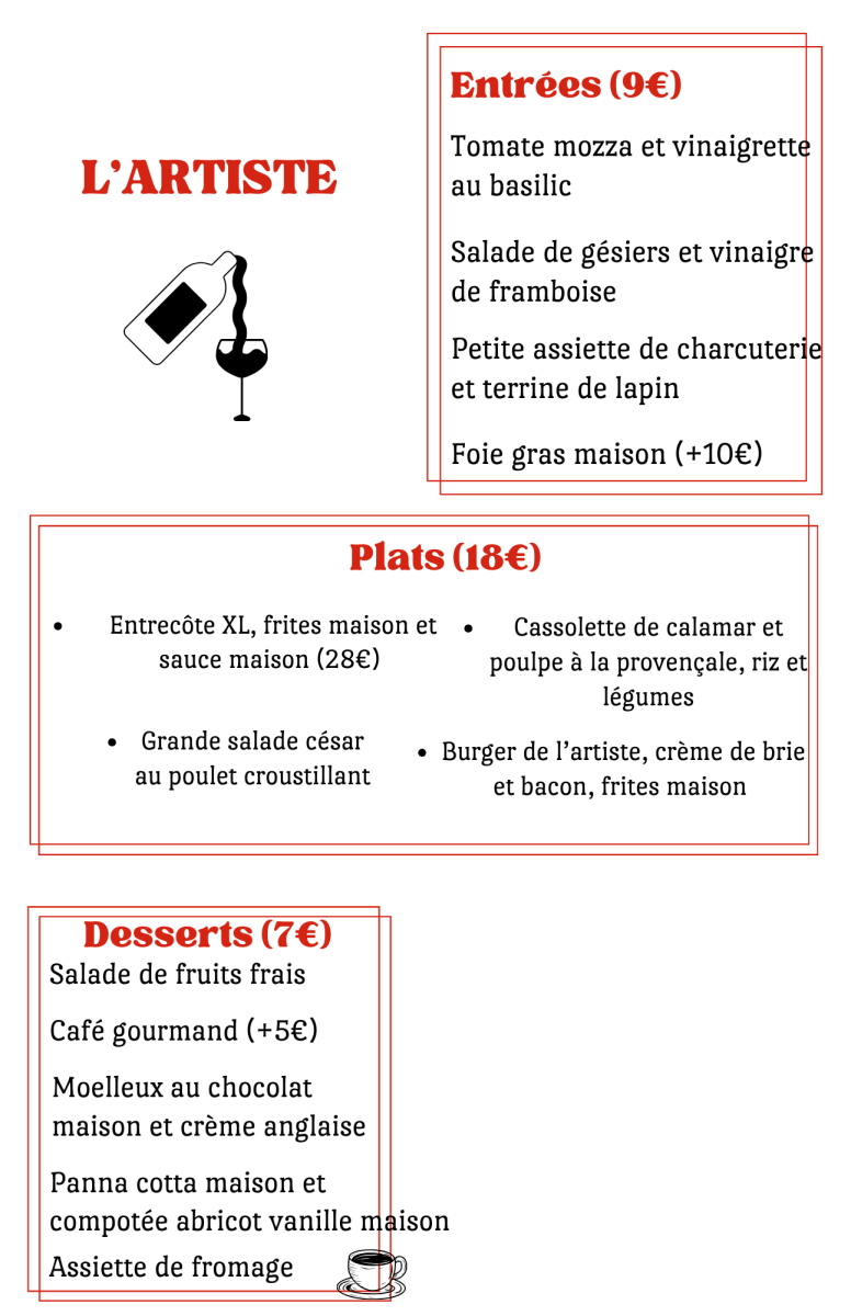 Ci-joint la carte de ce Vendredi 27 Février au soir. Au menu, salade de gésiers, burger de L'Artiste et salade césar. En dessert, panna cotta maison et compotée d'abricot maison !