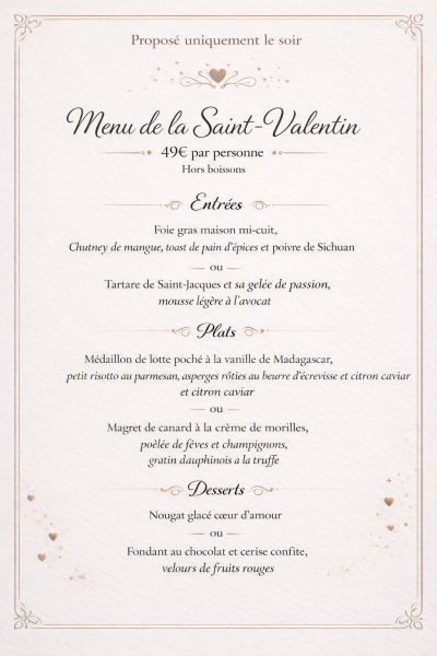 LE SOIR : menu spécial Saint-Valentin – une expérience gourmande pensée pour les amoureux