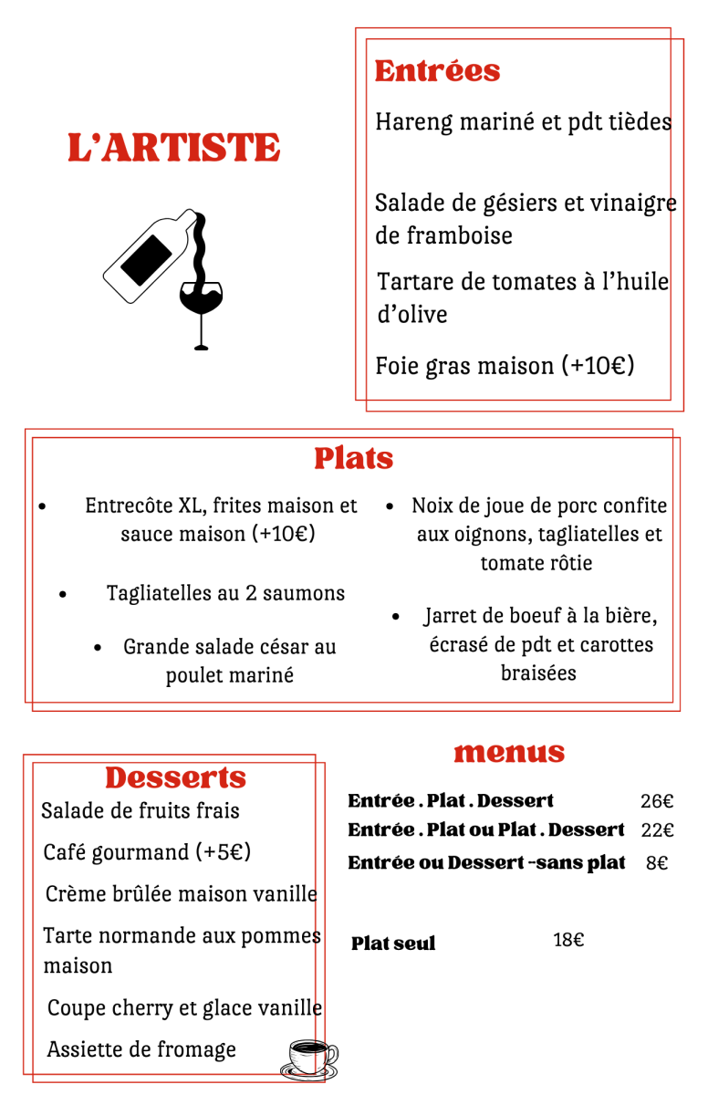 Ci-joint le menu de ce Mardi 17 Mars. Au menu du jour, hareng mariné, jarret de boeuf à la bière et joue de porc confite. En dessert, tarte normande aux pommes maison !